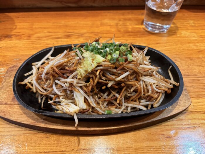 運ばれてきた焼きそばは、熱々の鉄板に盛られていて、湯気が立ち上っています。