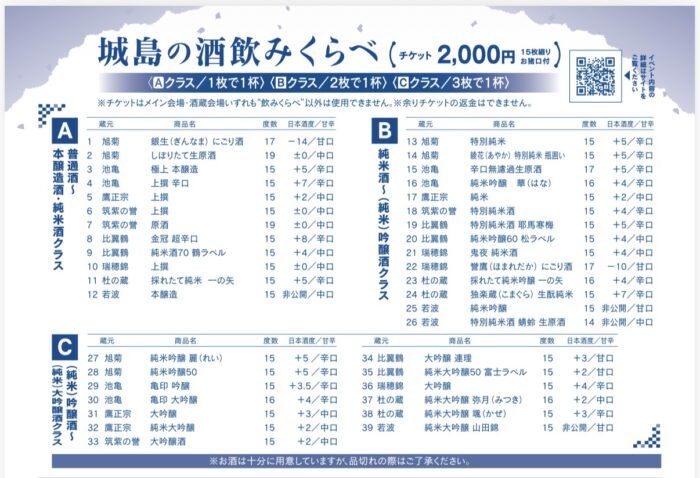 チケットには重要なルールがあります。お酒は3つのクラスに分かれており、Aクラス(本醸造酒や純米酒など)はチケット1枚、Bクラス(純米吟醸クラス)は2枚、Cクラス(大吟醸・吟醸酒クラス)は3枚必要なのです。