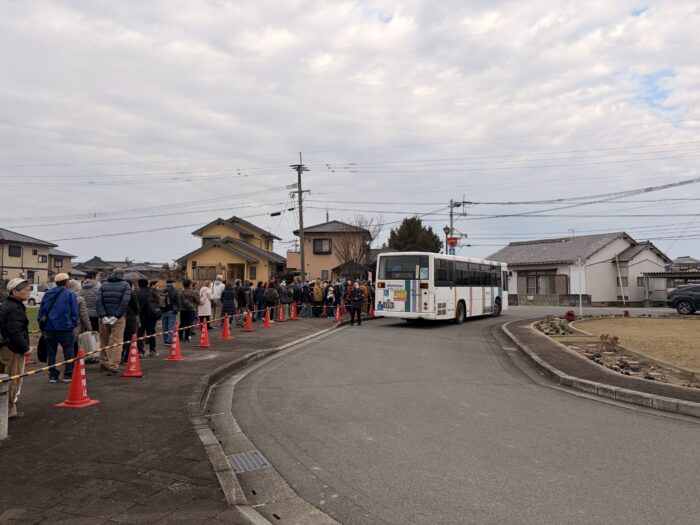 シャトルバスの列を見て、三潴駅だけでなくJR久留米駅方面などの別ルートも検討してみてください。